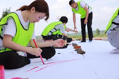 全体成员合作创作一幅宇龙主题的纳斯卡巨画。教练将巨画草图以及8块1m宽10m长的空白画布下发,并初步讲解巨画的绘制方式。
